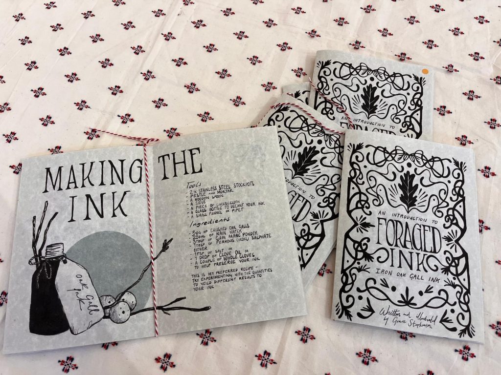 Grace’s zine Foraged Ink: An Introduction to Iron Oak Gall Ink will also be available separately. Illustrated using oak gall ink, this zine is the perfect resource to learn how make your own oak gall ink at home.